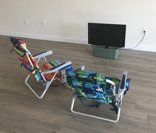We'll be "glamping" for a while as we have no furniture or silverware or hangers... our stuff comes in about a week. At the end of the day when we're done the constant string of phone calls and orders with ceiling scrapers, painters, pool guys, landscapers, blind manufacturers, Amazon...we like to kick back with a cocktail in our beach chairs, parked in front of a tiny television sitting on an inverted plastic tub, like a boss.