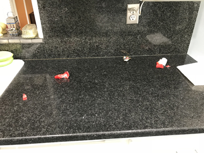 Step One: Wake up the day she's leaving to find some sort of Kit-Kat wrapper modern art on the counter. I understand not throwing away your trash, leaving it on a table maybe... but how exactly does it get strewn about like this unless you're trying to make your aunt's head explode? |
