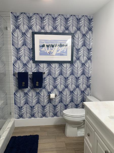 We were struck temporarily insane and decided to go for it. Yikes. This is peel-and-stick wallpaper from Amazon, and it does look pretty good---gave a very white bathroom a little punch, but it was NOT easy. I can't even imagine attempting it with old-timey glue & paper!