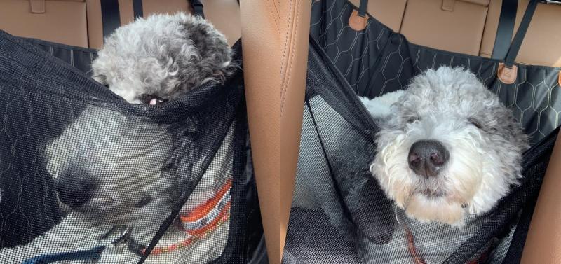We drove to the west coast of Florida to visit my mother-in-law (aka, Mariska) last week, and Archer isn't a fan of long drives in his harness: