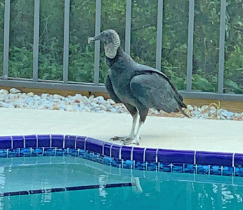Figures the DAY after we sold it, the vultures showed up at the new house. Literally. Now what's THAT supposed to mean??! Drinking out of our pool like avian thugs and eyeballing us like portents of doom...