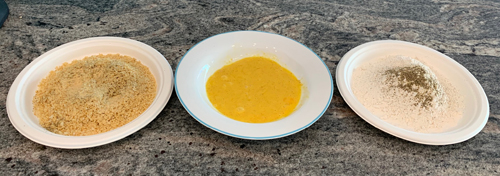 Setup three plates/shallow bowls -- one with flour and pepper, one with egg and buttermilk, one with bread crumbs and all the other seasonings you want to use mixed into a tasty mixture.