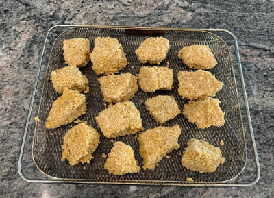 Now spray those nuggets WELL with the spray olive oil. Top and bottom. They have to be wet to fry instead of just bursting into flame like charred paper.
