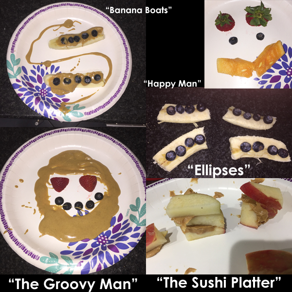 In case you'd like to experiment with dog fruit artistry, below are Mike's latest creations using banana, melon, blueberries, apples and melted peanut butter. Gordon's in heaven.